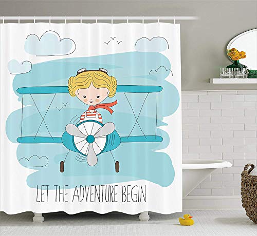tgyew Adventure Shower Curtain, Cute Girl Flying a Plane on Sky Cartoon Child Dream Imagination, Fabric Bathroom Decor…