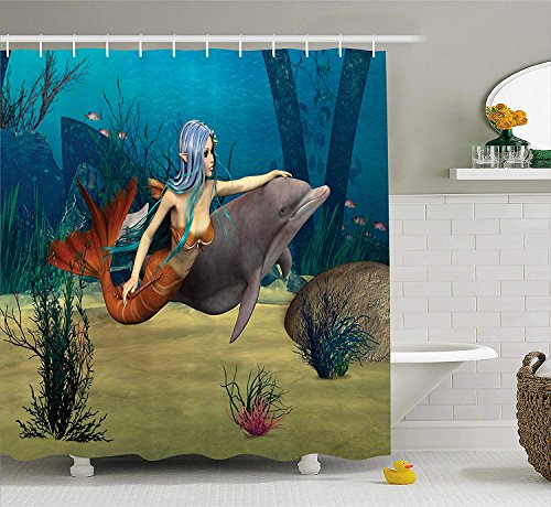 tgyew Mermaid Shower Curtain, Fairy Marine Cute Mermaid Girl and Dolphin Fish Swimming Underwater in Blue Ocean Image…