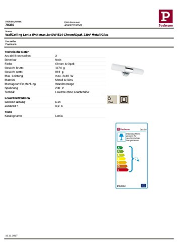 watt: max. 2×40 W la domination maximale: 2 x 40 W la tension de service: 230 V couleur: Chrome Matériel: Acier largeur utilité: 330 mm hauteur: 80 mm bousillé: 105 mm le décor: E14 Technique: sans ampoule Lieu d’installation: montage au mur Indice de défendu IP: IP44 la forme de défendu: la forme de défendu II