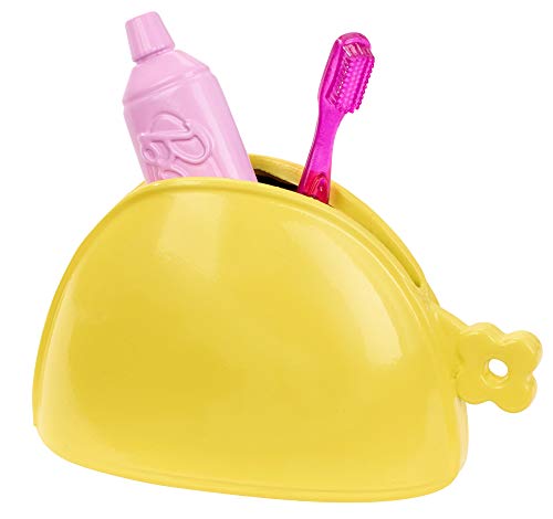 Les accessoires de voyage emblématiques compris dans le coffret sont décorés de couleurs vives et de décalcomanies rigolotes. Il y a notamment un coussin de voyage, une bouteille d’eau, une brosse à dents, un tube de dentifrice, un casque et un téléphone.