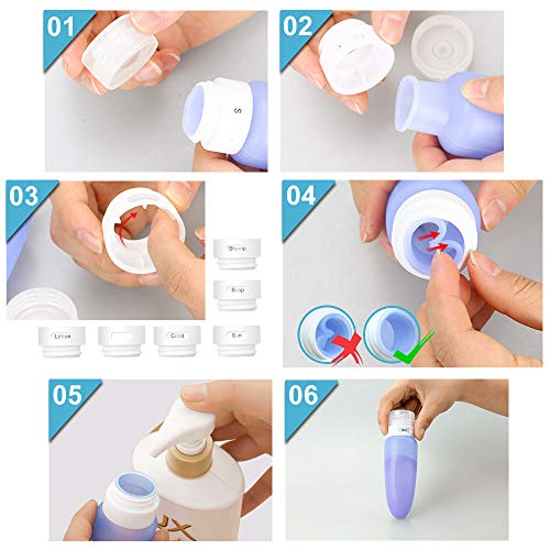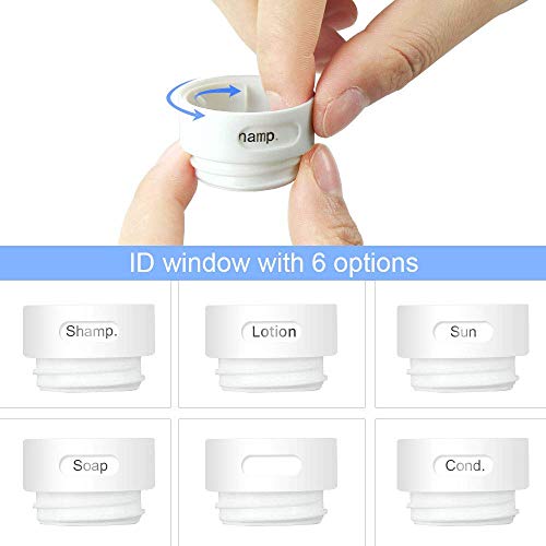 Facile à utiliser et Carry Il y a Lotion, Air, Soleil, Shamp, savon et blanc 6 étiquettes différentes sur chaque bouteille. Faites tourner les languettes du capuchon d’identification et sélectionnez l’étiquette désirée. (Étapes spécifiques Voir l’image) Le tube de la bouteille, une partie entière lable, et le bouchon de la bouteille sont littéralement séparés, facile à utiliser, installer et enlever. La bouche de la bouteille, il est facile de vider, nettoyer et remplir les bouteilles en quelques
