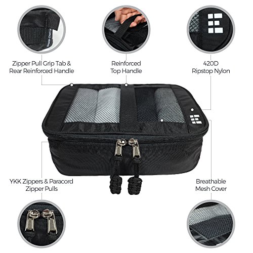 LES SEULS CUBES DE RANGEMENT DONT VOUS AUREZ BESOIN – Fabriqués à partir de Nylon Ripstop 420D Double épaisseur, résistants aux liquides et aux déchirures. Équipés de fermetures éclair YKK, de Paracorde en tressage Cobra et de Tirettes sécuritaires. Les bords renforcés aident à maintenir la forme du cube afin de protéger vos vêtements.