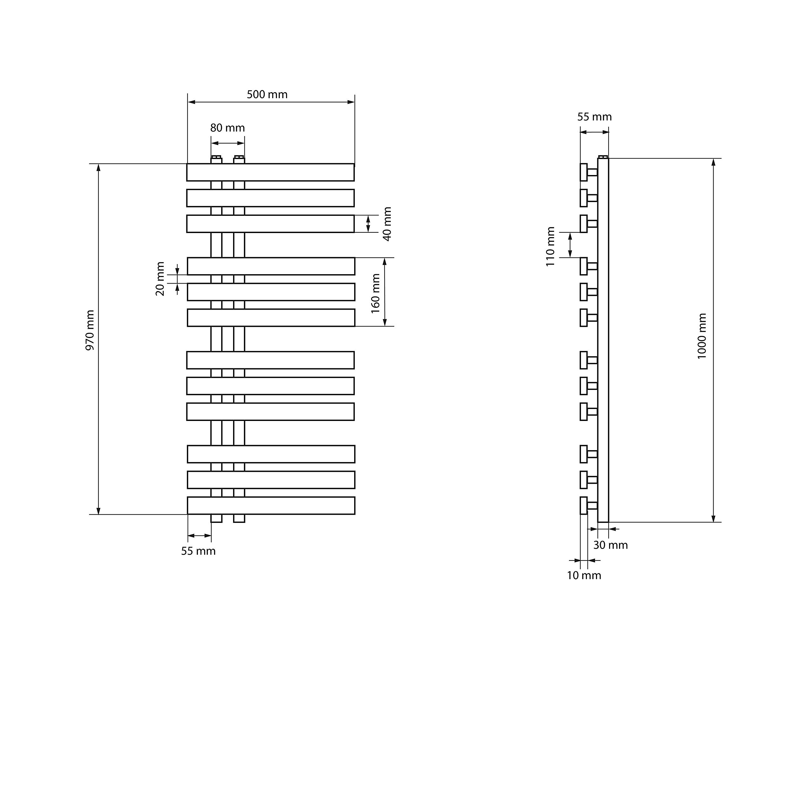 INFORMATIONS TECHNIQUES: Largeur (mm): 500, Hauteur (mm): 1000, Nombre de tubes: 12, Connexions (mm): 50, Dimensions des tubes: 40 * 10 * 1,2, Profil: 30 * 30 * 1, 5, Puissance standard chrome (watts): 269, filetage du raccord: G1 / 2 « , dimension du raccordement: 50 mm, pression de service maximale: 5 bar, pression d’épreuve: 6,5 bar, couleur: chrome, distance au mur: environ 6,5cm