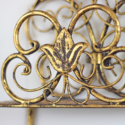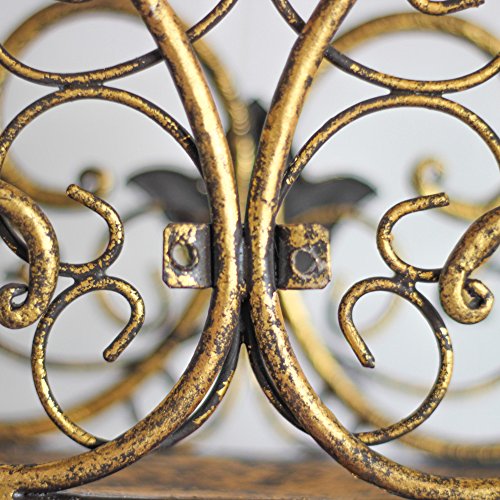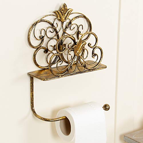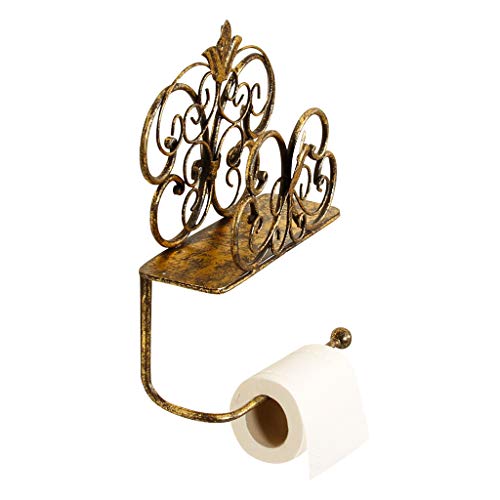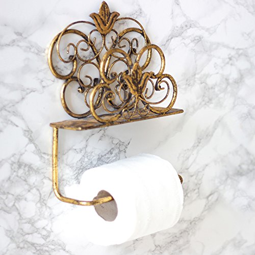 Traditionnel rouleau de papier ablution avec section de rangement à cause le à ce niveau. En métal et fini à cause un or antique avec plus foncée ou vieilli, ajouter style vintage à une salle de débarbouillage ou vestiaire. Design travaillé, moulé décoratif sur le haut avec feuilles et bouclés Vines, créer une plaque de rangement non-voyant à cause un magazine, journaux ou des livres. En dessous du support il y a un solide bar à cause sécuriser un papier ablution.