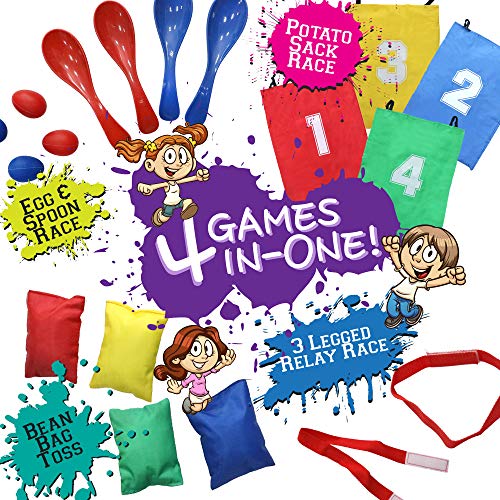 Plus d’info – Nos 4 jeux d’proximité contiennent 4 sacs de course en sac, 4 kits de course à l’œuf, 4 sacs de fèves et 2 bandes de course à 3 pattes – En plus du plaisir et du rire, les kits encouragent et améliorent la coordination, l’équilibre et la synergie des équipes, etc – vraiment un excellent achat !
