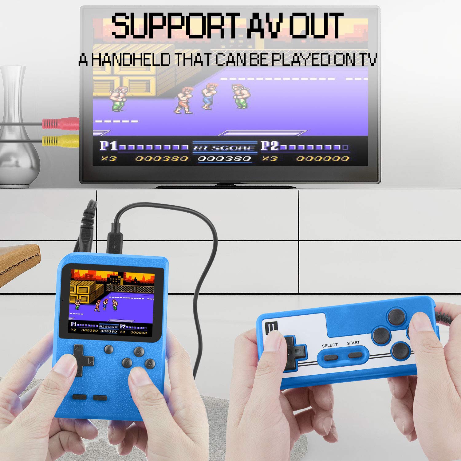 ▲ Support pour jouer à la télévision et jouer à deux joueurs — Il existe un câble de sortie AV et une jolie console de jeu vous permettant de connecter les consoles de jeu à la télévision, puis de profiter des jeux vidéo à deux joueurs animés et passionnants sur grand écran.