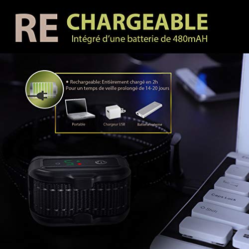 【RECHARGEABLE & ÉTANCHE】Batterie intégrée de 480mAh rechargeable par Câble USB, peut être entièrement chargé en 2h pour un temps de veille prolongé de 14-20 jours. ECONOMIQUE et ÉCOLOGIQUE (pas besoin de changer les piles). Le collier étanche(IPX7) permet une utilisation en toute sécurité du collier à l’intérieur et à l’extérieur, plus besoin de l’enlever et de le remettre à votre animal en fonction de la météo.