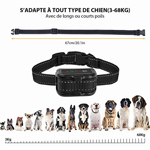 【ADAPTÉ À VOTRE CHIEN】FACILE d’utilisation : Les choc, les vibrations, le son, ils lui permettent de s’adapter à tous les chiens(réglage unique Dans votre chien). La sangle en Nylon de haute résistance est LÉGÈRE et AGRÉABLE à porter. S’adapte à tout type de chien(3-68KG) avec de longs ou courts poils grâce à ses conducteurs assez longs.