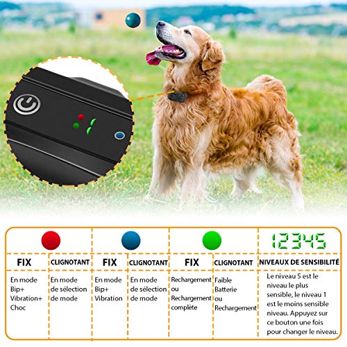 【2 MODES RÉGLABLES ET 5 NIVEAUX D’INTENSITÉ】Le collier a 5 niveaux de sensibilité réglable et 2 modes d’entraînement – Bip+Vibrations & Bip+Vibrations+Chocs légers et sûrs stoppant efficacement les aboiements sans nuire aux chiens de tous types. Dans la sécurité de votre chien, un récepteur anti-jappement intégré, doté d’un mode de protection automatique, désactive le collier s’il s’active 6 fois en une minute en mode Bip+Vibrations+Chocs et reprend ses fonctionnalités au bout de 2 minute.