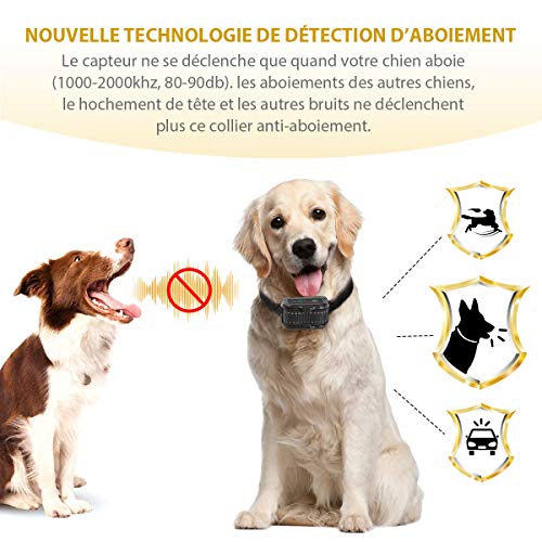 【DÉTECTION D’ABOIEMENT INTELLIGENTE】Une technologie révolutionnaire et des renouvellements innovants ont été mises en œuvre dans cette dernière version du collier doté de la dernière puce intelligente anti-lésion. Le collier contient le système de détection d’aboiement le plus intelligent qui prévient les faux déclenchements. Par conséquent, seuls les aboiements de votre chien peuvent déclencher le collier et non les aboiements des autres chiens à proximité.