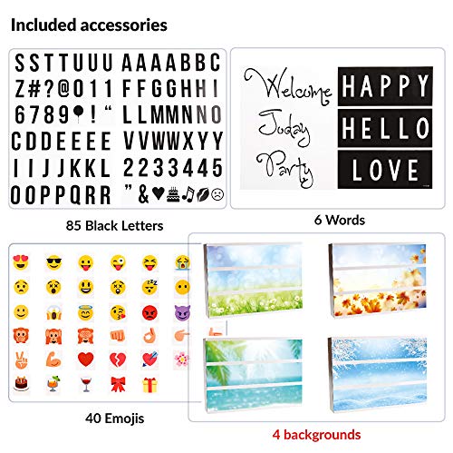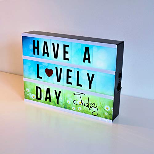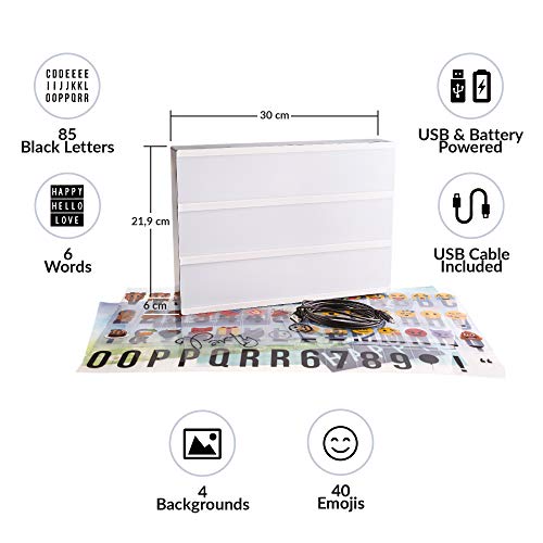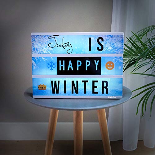 Boite lumineuse à personnalisée format A4 composée d’une structure en PVC noir avec plaque diffusante blanche affable sur 3 lignes les lettres et symboles noirs de votre choix à élire par les 4 Abîme-Plans avec les saisons, 40 Emojis, 6 Mots, USB Cable, 85 Lettres Noir fournis. Cette lampe est équipée d’un interrupteur sur le côté. Composez les messages de votre choix Paiement à cette boite lumineuse personnalisable inspirée des anciennes enseignes de cinémas. Paiement aux 85 lettres et symboles fournis, changez de texte selon vos envies en les glissant à cause les rainures prévues à cet effet et customisez votre lampe à volonté ! Posée ou accrochée au mur, cette lampe sera le reflet de votre humeur… Fontionne avec 6 piles 1,5V AA (non fournies) ou 5V DC adaptateur (inclus). LED intégrées. Inclus: 1x: Q,X,Z,#,?,@,0,5,6,7,8,9, ,!, », »,&,, ,, ,, 2x: B,C,D,F,G,H,J,K,M,N,P,R,S,T,V,W,Y,1,2,3,4 3x: L,O,U,I 4x: A,E