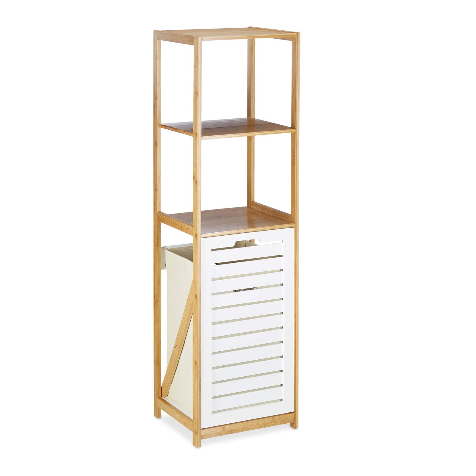 2 en 1 : Étagère de débarbouillage pratique en bambou avec panier à linge intégré – Avec 3 étagères ouvertes à cause serviettes, ustensiles de salle de débarbouillage, cosmétiques et bien plus encore. Dimensions (H x l x P) : à peu près 130 x 37 x 33 cm.
