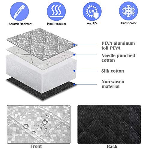 Quatre couches de protection : à nous pare-brise de voiture se compose de feuille d’aluminium PEVA, de coton perforé, de soie et de doublure non tissée. La couche de surface en feuille d’aluminium et le coton retardateur de flamme de haute qualité, assure une excellente résistance à la déchirure, fonctionne également très bien en cas de chaleur, imperméable et résistant aux rayures.