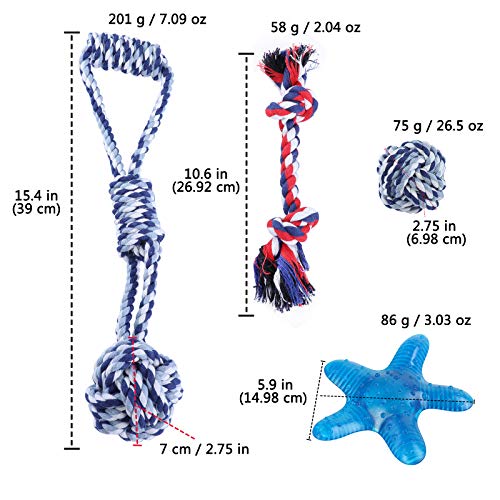 HOKEMP Chien Jouet Corde Coton Durable Chiot Jouet à mâcher Lot de 4 DE Dentition Jouet d’entraînement pour Petits et Moyens Chiens Incluent Tug of War Chiot Corde, Nourriture Distributeur Jouets