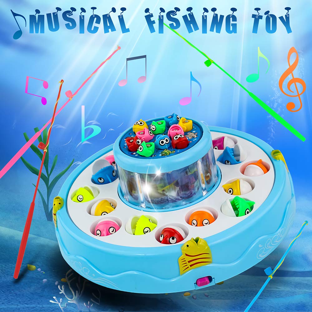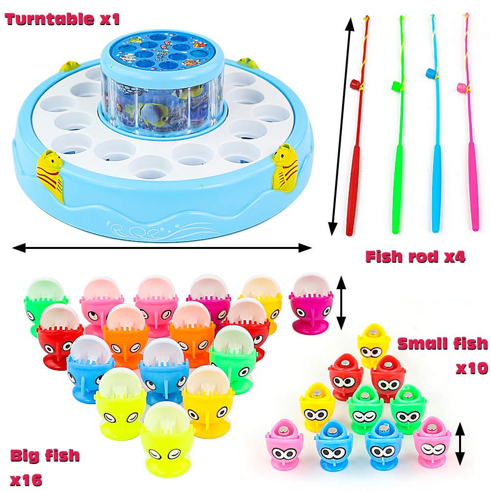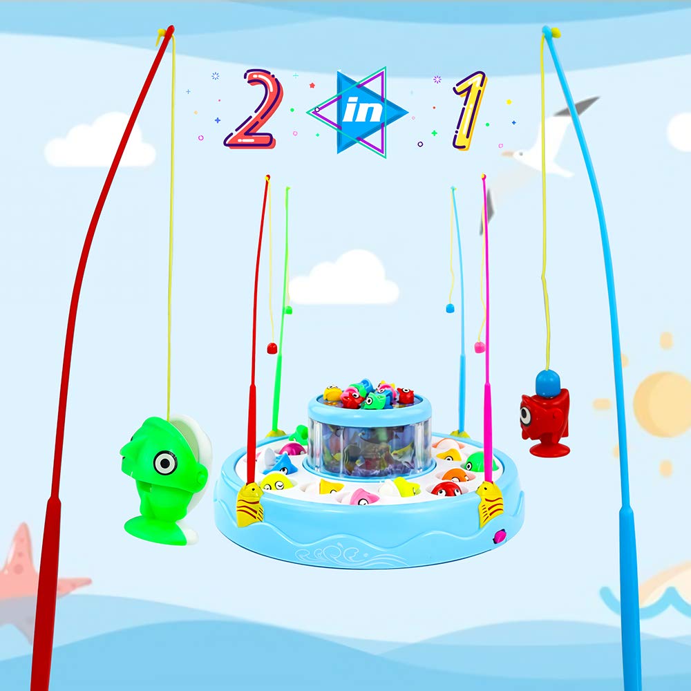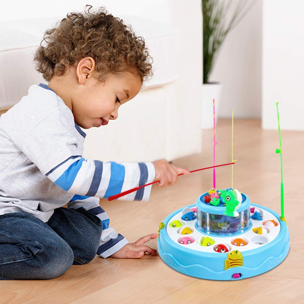 SET DE PÊCHE DOUBLE COUCHE: Rotations à 360º avec musique, Panneau double couche pivotant électrique en forme, 4 cannes à pêche,16 gros-poissons et 10 mini-poissons colorés.