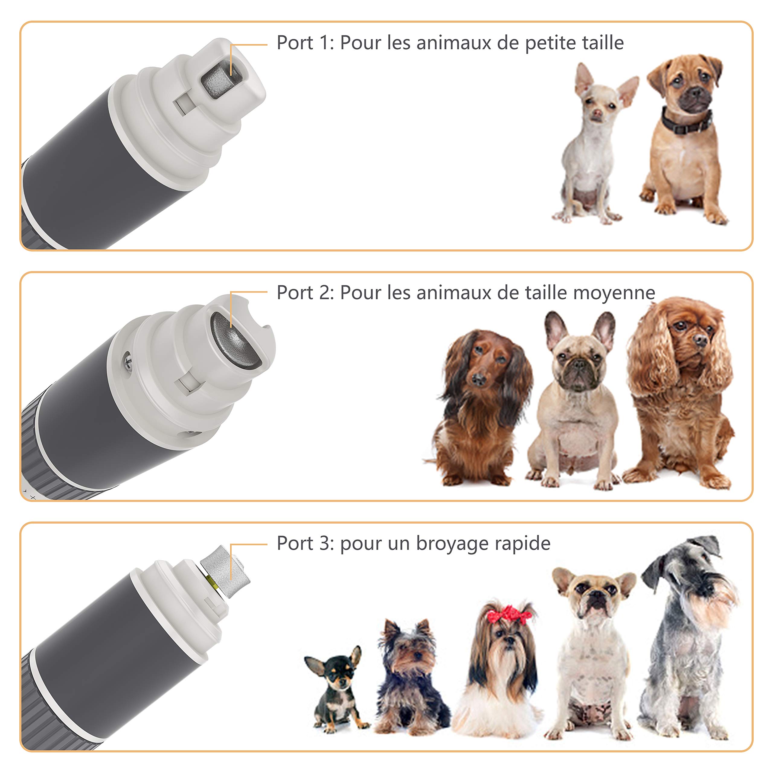 🐾TÊTES DE MEULAGE ET 3 PORTS DIFFÉRENTS – Professionnelle et efficace. Vous pouvez choisir un port et une vitesse appropriés selon la taille de l’animal et des caractéristiques de ses ongles. Remarque: pour les ongles trop longs, il faut les couper avec un coupe-ongles avant de les broyer. Pour une plus grande efficacité, retirez le capuchon de protection lors du meulage de gros ongles.