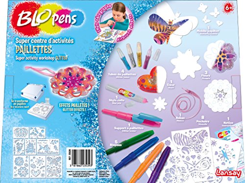 Contient : 8 pochoirs, 5 Blopens, 1 support à paillettes, 1 stylo de colle,4 tubes de paillettes, 1 ruban de 1m20, 5 créations à réaliser, 1 boîtepupitre et 1 notice.