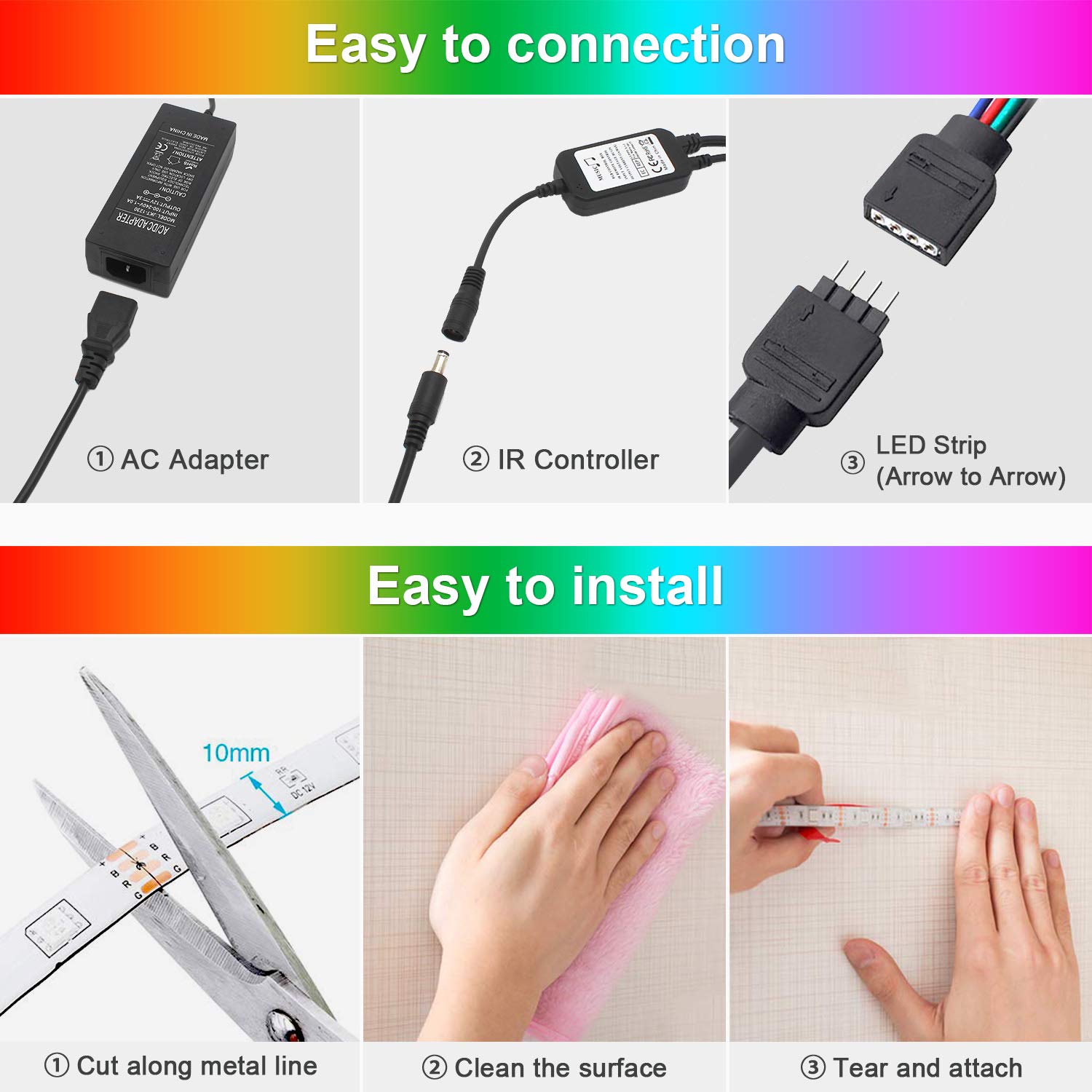 Installation Facile – Grâce à l’auto-adhésif, vous pouvez installer facilement ce bandeau LED. Et l’autocollant est en bonne qualité, il colle très fort ! NB* Veuillez coller sur un endroit propre et plat !