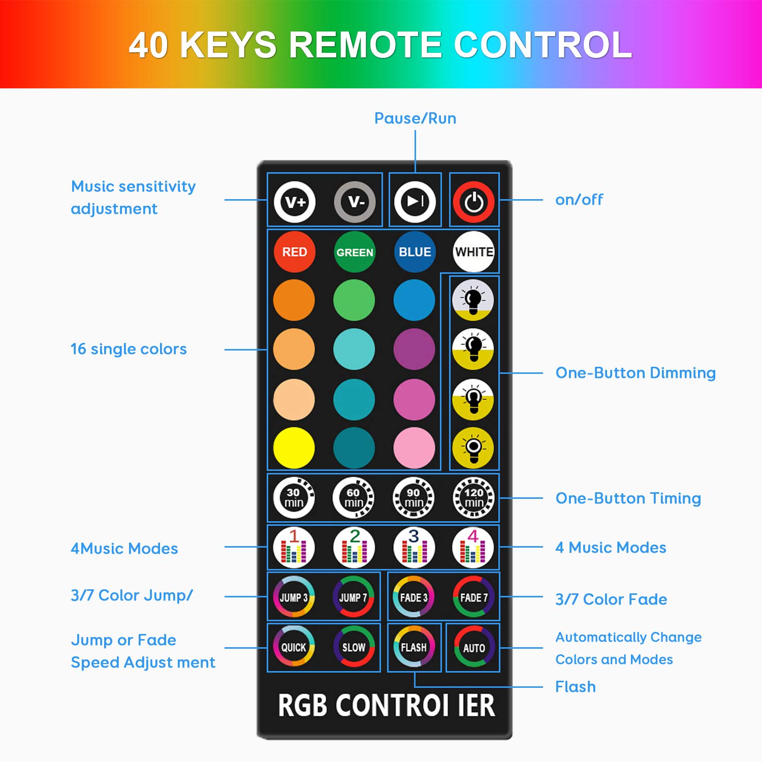 Controllé par la Musique – Le Bande LED va changer avec la musique, ce que vous faites, est d’émettre de la musique ! Pour satisfaire à votre différents demandes, il y a 4 modes musicals pour vous. De plus, vous pouvez choisir la sensibilité de la musique selon votre demandes.