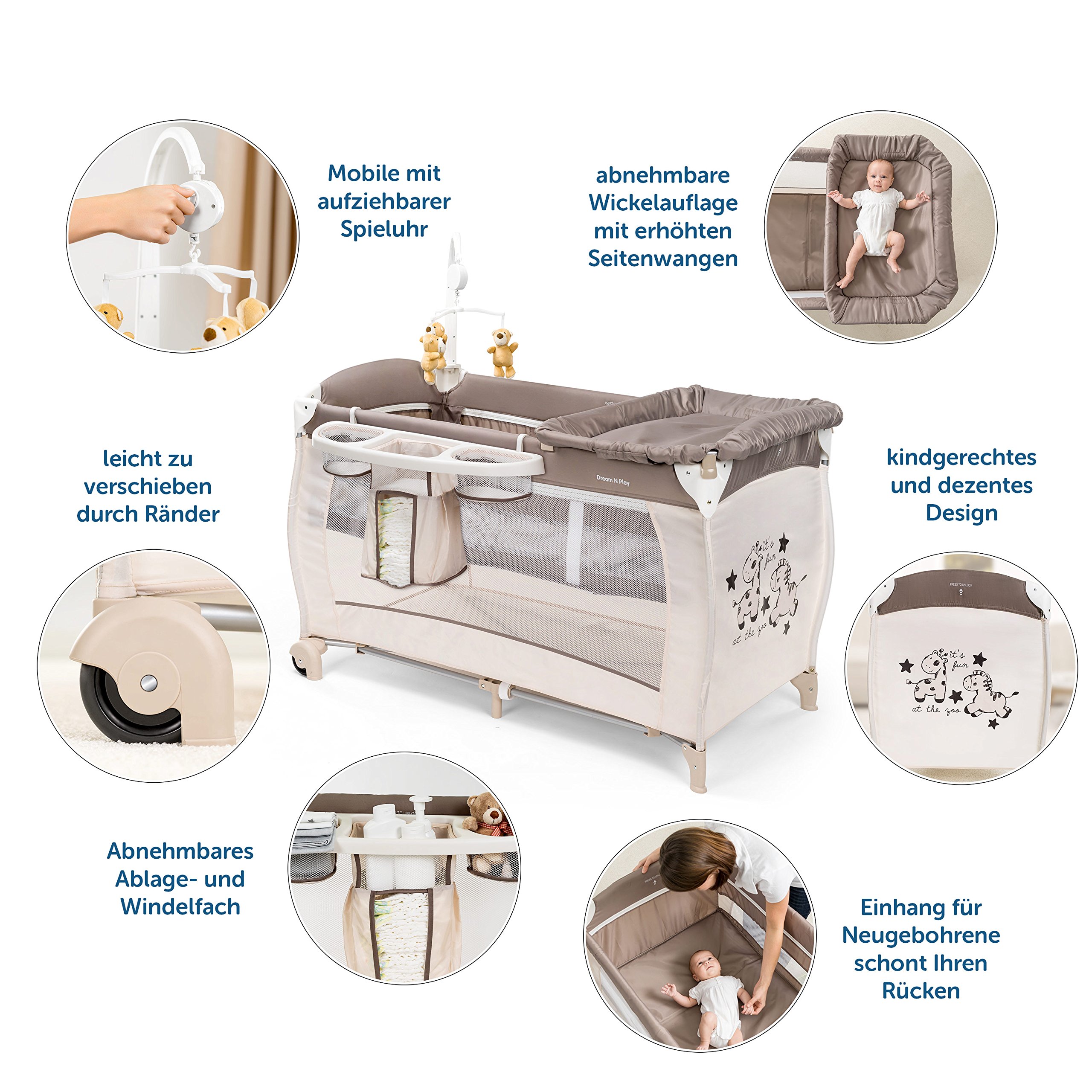 Ce lit d’appoint stable et bien équipé, vous simplifiera la vie en famille lors vos voyage : Ici votre bébé pourra dormir pour un environnement familier et se sentira abrité. Le mobile sonore amovible apaise et aide à s’apaiser. De plus, il anime votre diminué à attraper les peluches encourageant ainsi sa motricité.