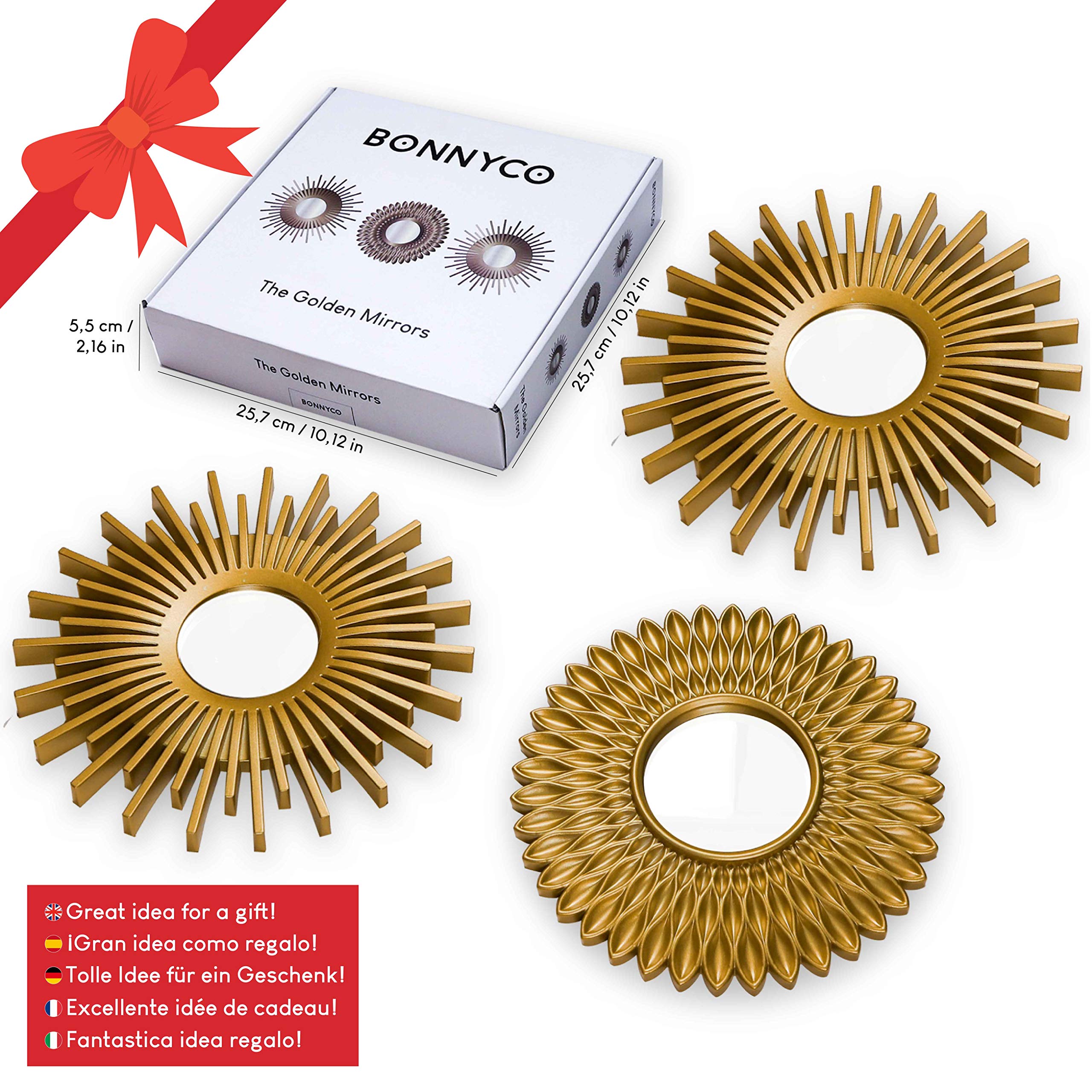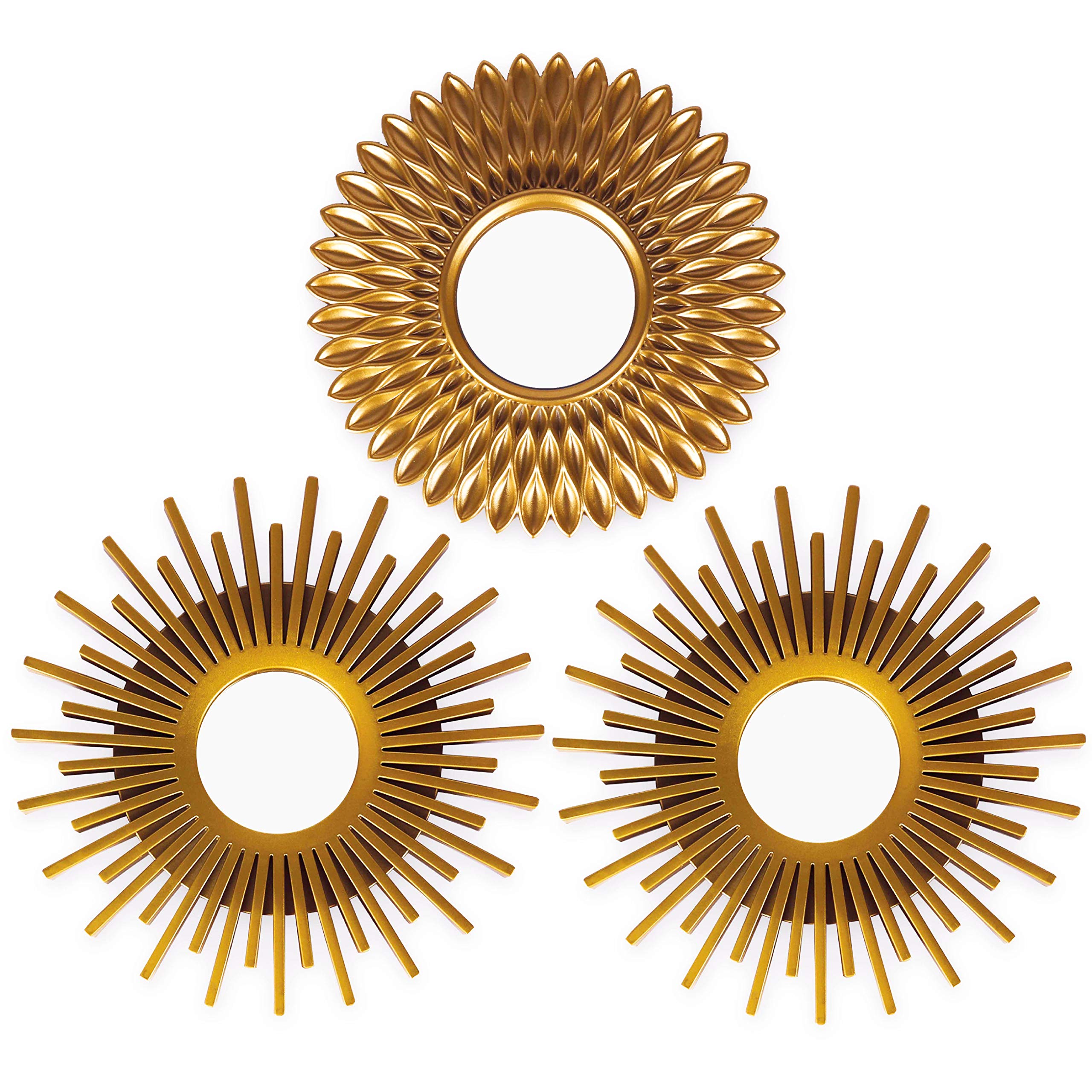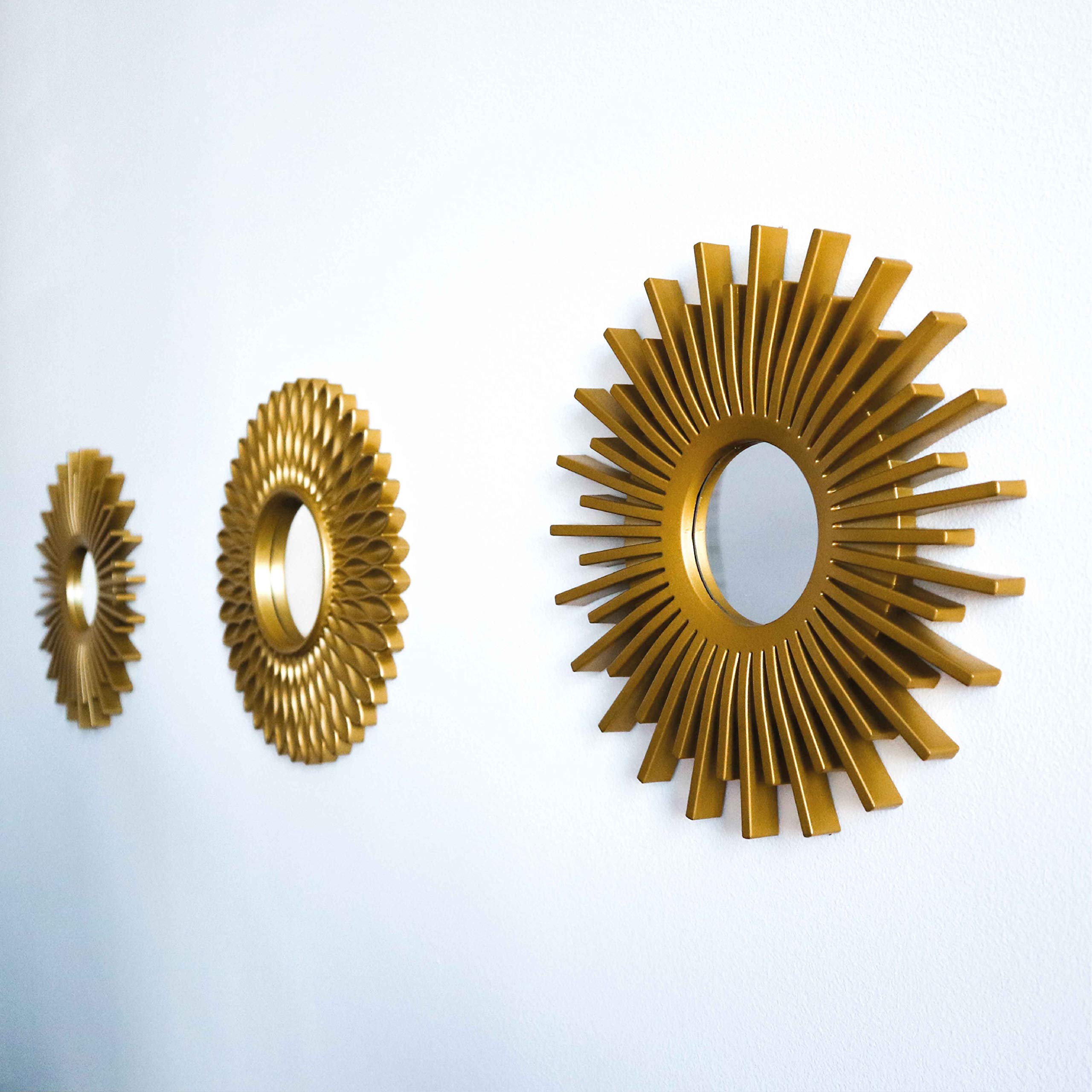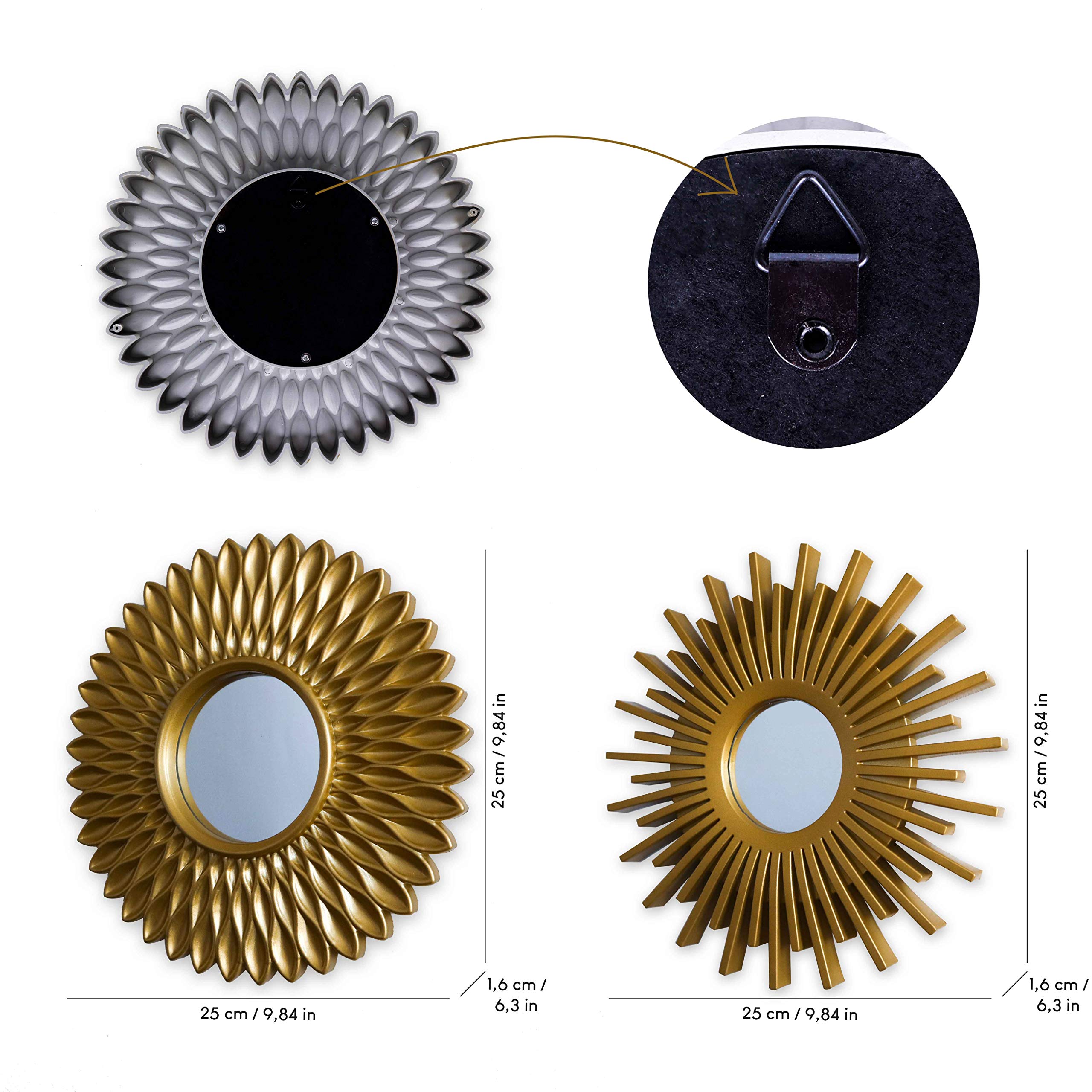 ✔ Lot de 3 miroirs dorés de 25*25*1,6 cm – 2 types de miroirs différents inclus, tous deux ronds. Ils ont également, à l’arrière, un sordide trou à cause les accrocher à un mur.
