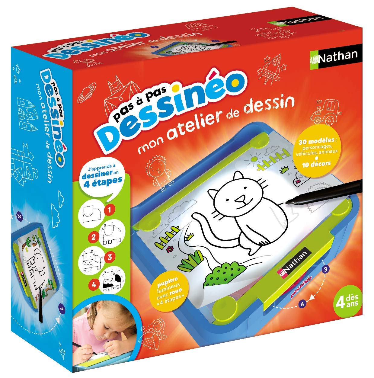 Inclus 1 plateforme 32 x 30x 9cm, 30 projets de dessins en 4 étapes, 1 stylo noir, Feuilles A4, instructions