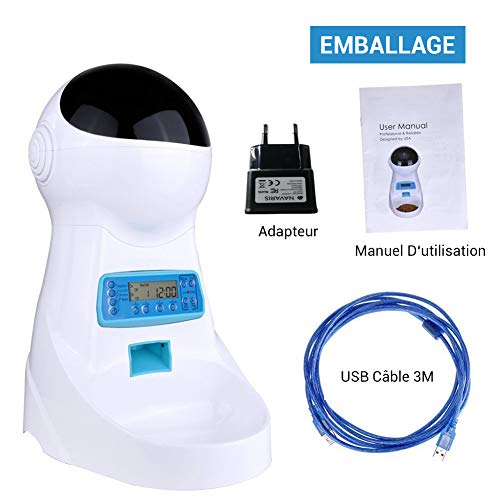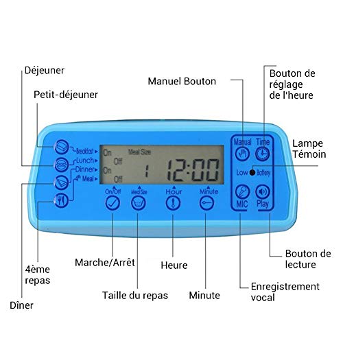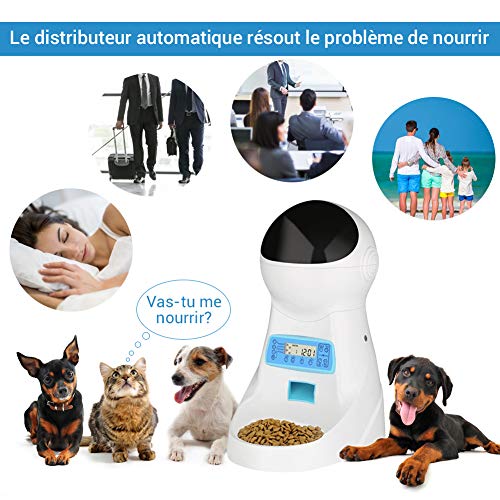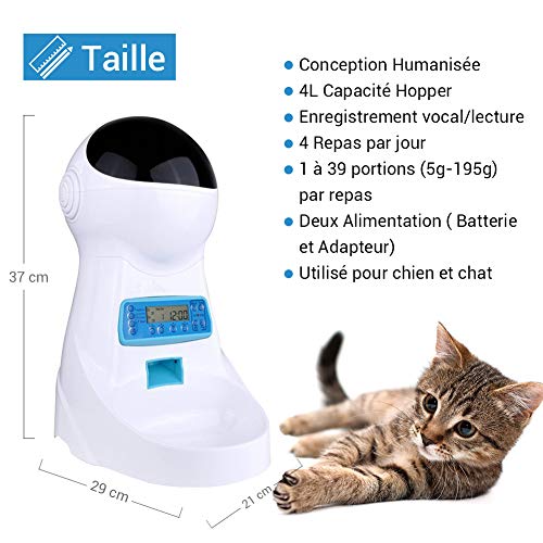 Alimentation Automatique: Ce distributeur de croquettes fournit portions flexibles de 1 à 39 portions par repas, 5g pour chaque portion, permet de donner jusqu’à 4 repas par jour, vous pouvez définir la qualité des aliments pour chaque repas par le panneau de commande