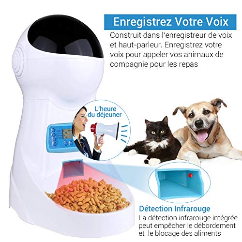 Fonction d’enregistrement sonore: Construit dans l’enregistreur de voix et haut-parleur, ce distributeur peut enregistrer votre voix pendant 10 secondes pour appeler des animaux de compagnie pour des repas, ne les laissera pas se sentir seuls si entendre la voix de leur propriétaire