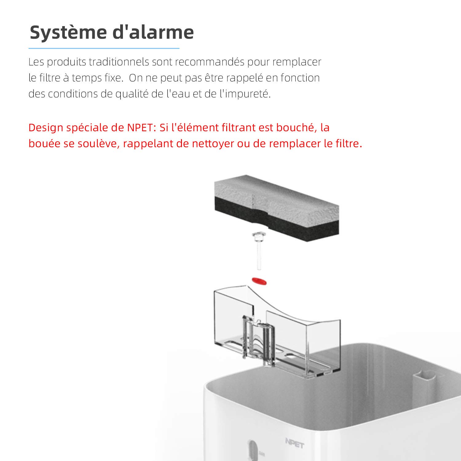🐾 【Mise à niveau du système d’alarme du filtre】 Conception spéciale NPET: Si l’élément filtrant est bouché, la bouée se soulève, vous rappelant de nettoyer ou de remplacer le filtre, assurez-vous que votre animal peut boire de l’eau saine