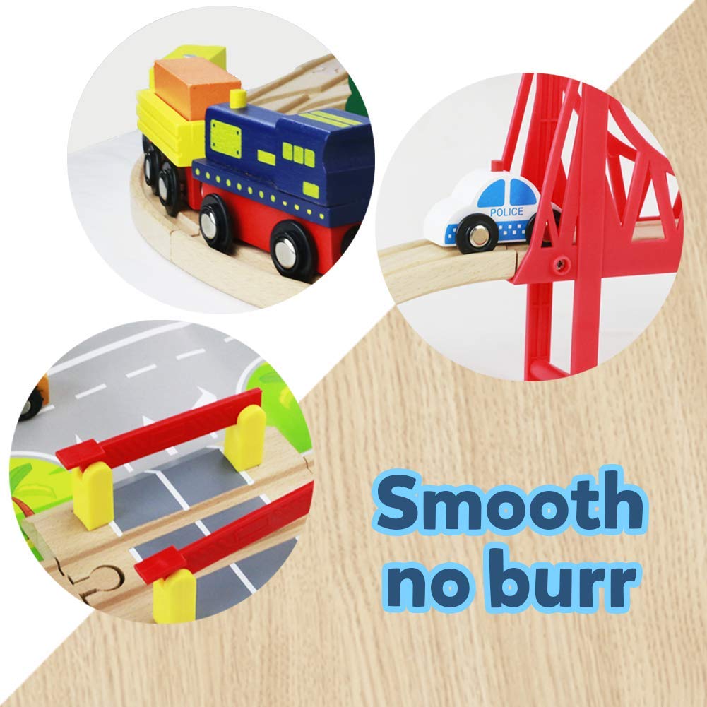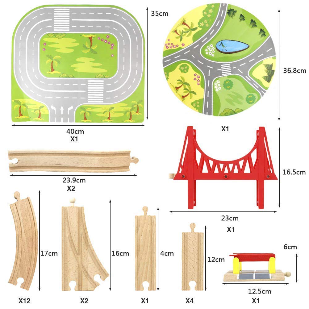 Classique Train en Bois: 82 pièces d’accessoires, dont rails, ponts, personnages, paysages, locomotives, chariots, trains transport,panneaux signalisation et d’autres accessoires, montage simple, les train enfant peuvent assembler indépendamment la voie désirée utilisez votre imagination.