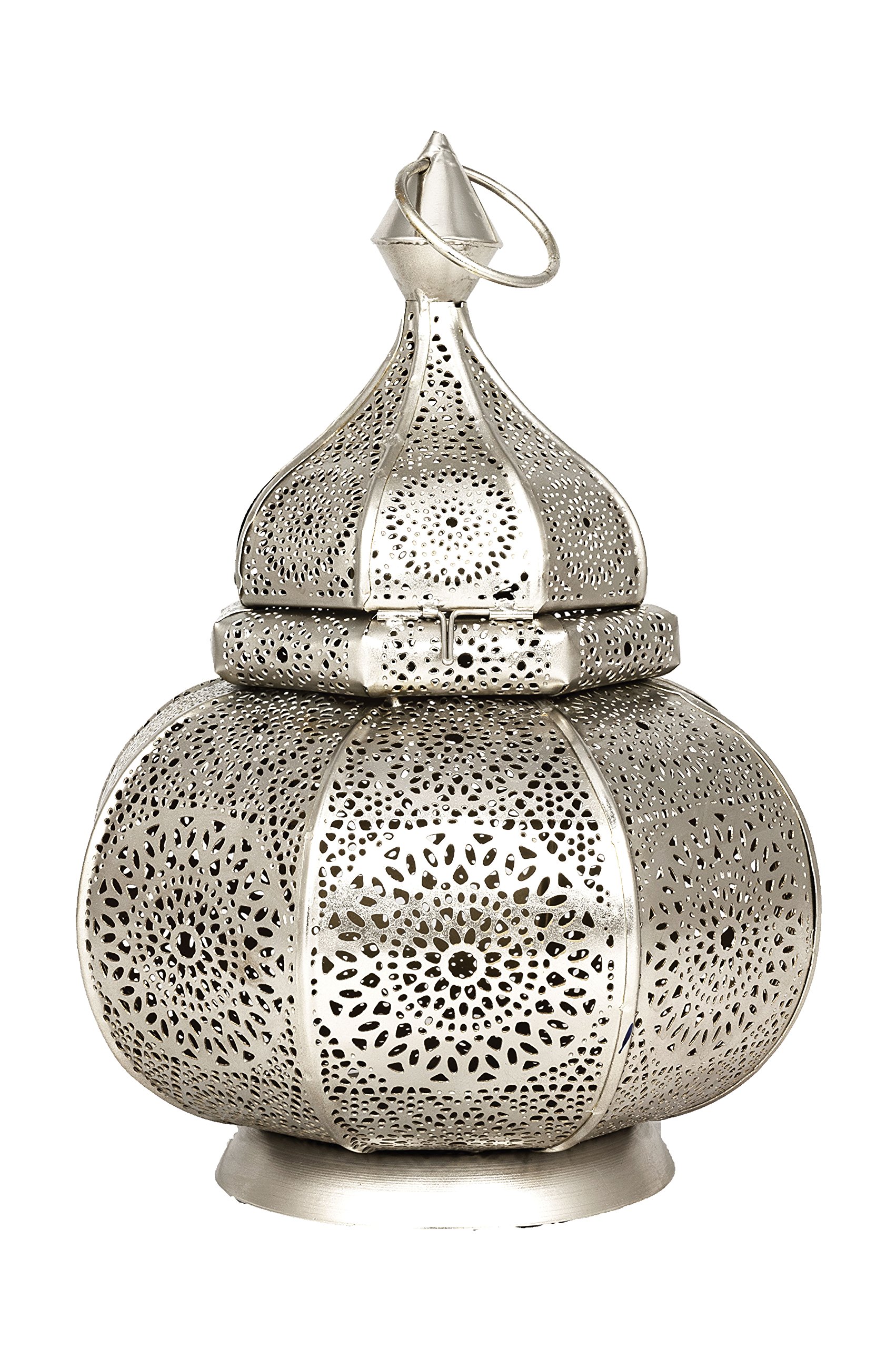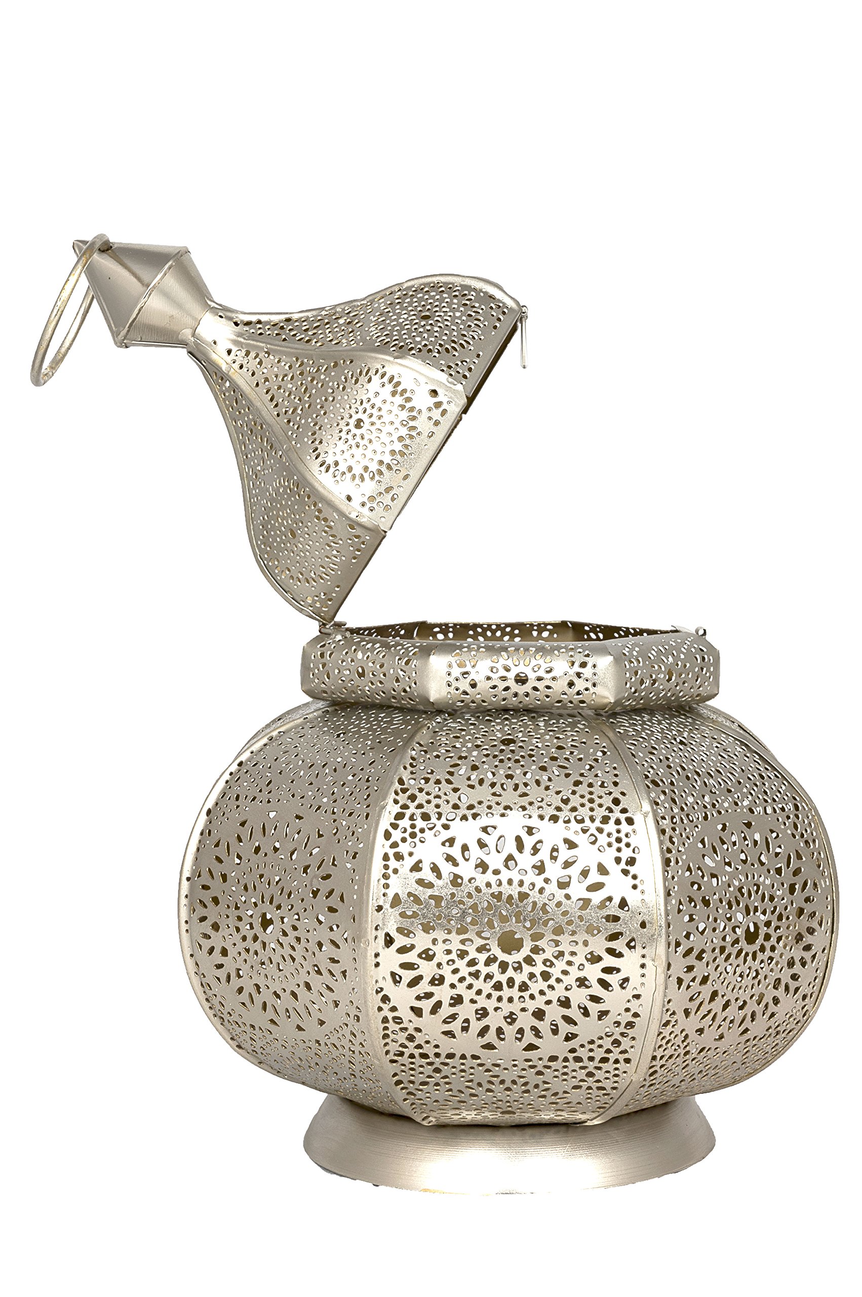 Photophore oriental fabriqué en l’inde, métallique, couleur argenté de l’alentours et or de l’intérieur, le design éblouissant capte la lumière de la bougie et la reflète à cause un bel effet, Grâce aux perforations précises et des ornements, vous recevrez une lumière unique et de belle ombre.