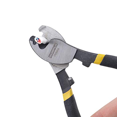 APPLICATION: Ils sont conçus pour faciliter la coupe des câbles, y compris la coupe des câbles en cuivre et en aluminium revêtus de cuivre et d’étain. Les pinces de coupe de câbles électroniques de 150mm sont capables de cisailler facilement des câbles souples en aluminium 4/0, 2/0 en cuivre souple, 7/8 pouces et des câbles de communication.