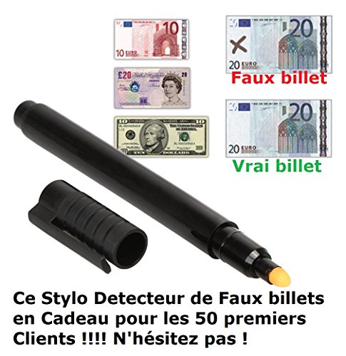 EN CADEAU POUR LES 50 PREMIERS CLIENTS: un Stylo Détecteur de Faux Billets. Marquez d’une croix le billet que vous voulez tester et si la croix est noire/marron foncé = le billet est faux. Fonctionne à cause les euros, les dollars et autres monnaies.