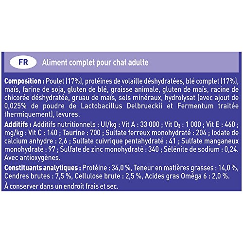 Composition : Poulet (17%), protéines de Volaille déshydratées, blé complet (17%), maïs, gluten de blé, graisse animale, gluten de maïs, gruau de maïs, racine de chicorée déshydratée, farine de soja, sels minéraux, hydrolysat (avec ajout de 0,025% de poudre de Lactobacillus Delbrueckii et Fermentum traitée thermiquement), levures.