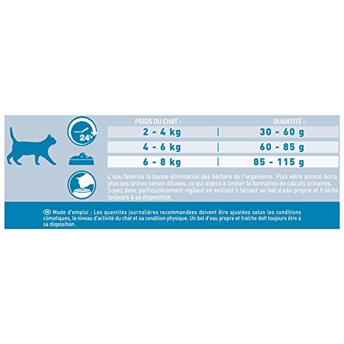 L’eau favorise la bonne élimination des déchets de l’organisme. Plus votre animal boira, plus ses urines seront diluées, ce qui aidera à limiter la formation de calculs urinaires. Soyez donc particulièrement attentif en veillant à offrir un bol d’eau propre et fraîche toujours à sa disposition. Si vous nourrissez votre chat dans la 1ère fois avec PURINA ONE, nous vous recommandons d’effectuer une transition : introduisez progressivement les croquettes dans son alimentation habituelle, sur une période de 7 jours, dans offrir son système digestif s’dompter au changement.Quantités journalières recommandées (g/jour) :Poids du chat / Quantité2 – 4 kg / 30-60g 4 – 6 kg / 60-85g6 – 8 kg / 85-115g Mode d’emploi : Les quantités journalières recommandées doivent entité ajustées selon les conditions climatiques, le niveau d’activité du chat et sa condition physique. Un bol d’eau propre et fraîche doit toujours entité à sa disposition.