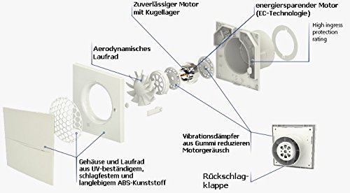 Bien sûr, le Quiet a également sur les valeurs intérieures respectés. Le ventilateur est dotée du moteur de la série Quiet standard fiable et silencieux. Vous recevrez un moteur de roulettes intégrées, basé sur les dernières technologies EC. Grâce à des amortisseurs caoutchouc afin de prévenir toute vibrations fiable, ce qui assure un fonctionnement silencieux et augmente en même temps la durée de vie.Le volume est de seulement 25 dB (a) à un chiffre d’affaires de 97 m³ d’air par heure. La grande classe de bâché IP45 permet même d’un montage en salle de bains (zone de bâché jusqu’à 1). Le Quiet style est équipé d’un clapet anti-retour, quels sont les courants d’air arrière énormément réduit. Une LED affiche également l’état de fonctionnement. Choix de manière, il y a le ventilateur peut aussi d’un hygrostat et temporisation ou capteur d’humidité ().