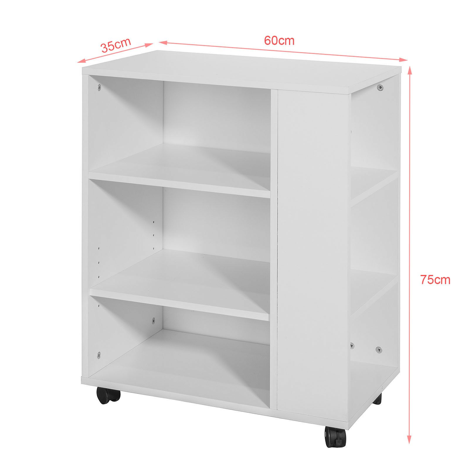 Meuble de rangement multifonction à roulettes avec grande capacité de stokage. Équipé de 6 tablettes résistantes et 4 roulettes.