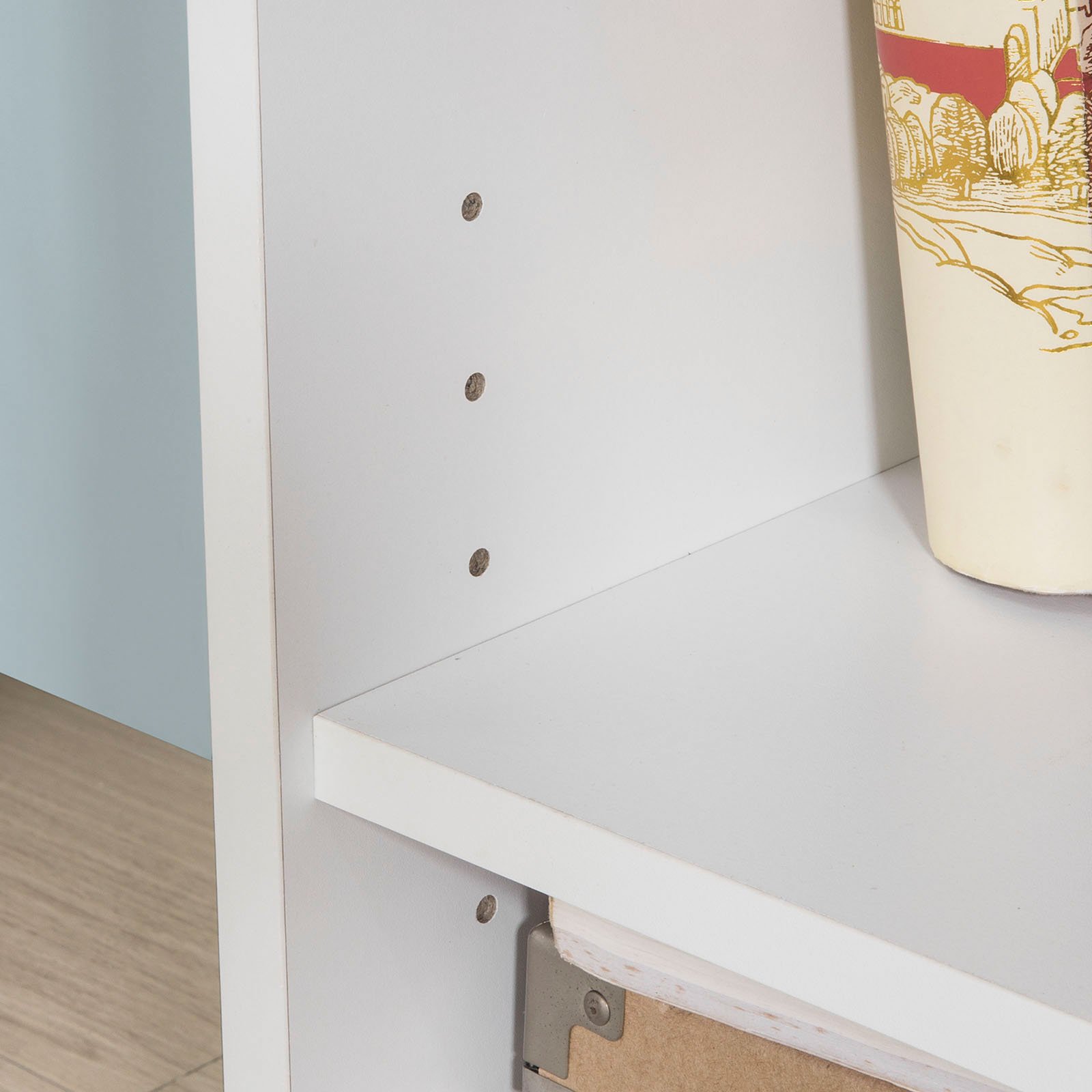 Avec 3 grandes tablettes résistantes et 3 tablettes latérales dans le rangement de fournitures de bureau ou de matériel bureautique.
