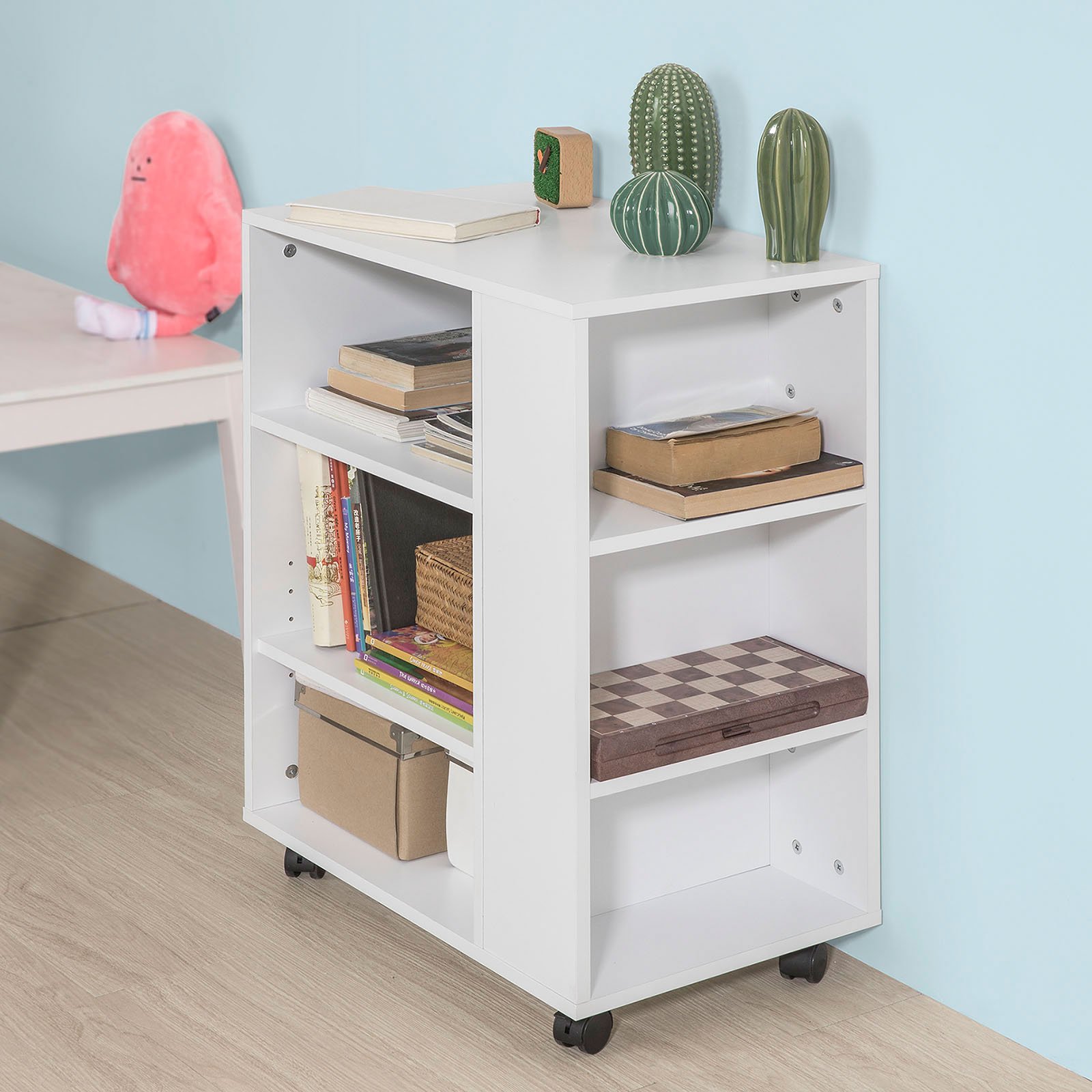 SoBuy FBT68-W Borne de Canapé Table Roulante avec étagères de rangement Bibliothèque à roulettes