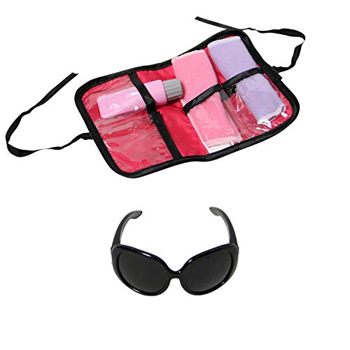 DOLL SUITCASE, Doll Travel Accessory Kit, Doll Traveling Pillow, Passport, 3 Boarding Tickets, Tablet, Smartphone, Camera, Hair Brush, and Sunglasses.