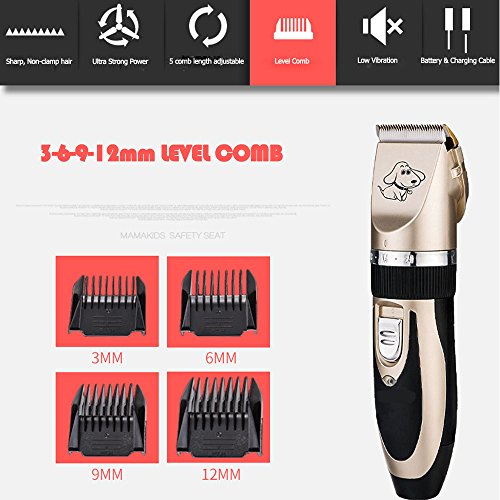 3. Coupe sûre et efficace : La lame est lame en céramique de titane, ce qui garantit la sécurité sans perdre sa netteté, garnit les cheveux pour animaux de compagnie avec un rendement élevé. Cette coupe de cheveux pour animaux de compagnie fonctionne en douceur. Elle est livrée avec 4 formats d’attaches pour peigne: 3mm, 6mm, 9mm et 12mm qui vous permettent de couper les cheveux de votre animal de compagnie à la longueur que vous aimez. Il est léger et facile à tenir.