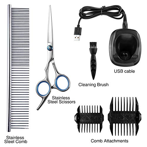🐾【Trois peignes + ciseaux en acier inoxydable】 – Comprend 2 peignes (3 mm, 6 mm, 9 mm, 12 mm), 1 peigne et 1 ciseaux (tous deux en acier inoxydable), 1 brosse de blanchissage, 1 câble USB, 1 base de chargement, marque Il est plus Approchable et plus sûr d’utiliser la machine même dans les nouveaux utilisateurs, idéal dans couper les poils de vos animaux domestiques.