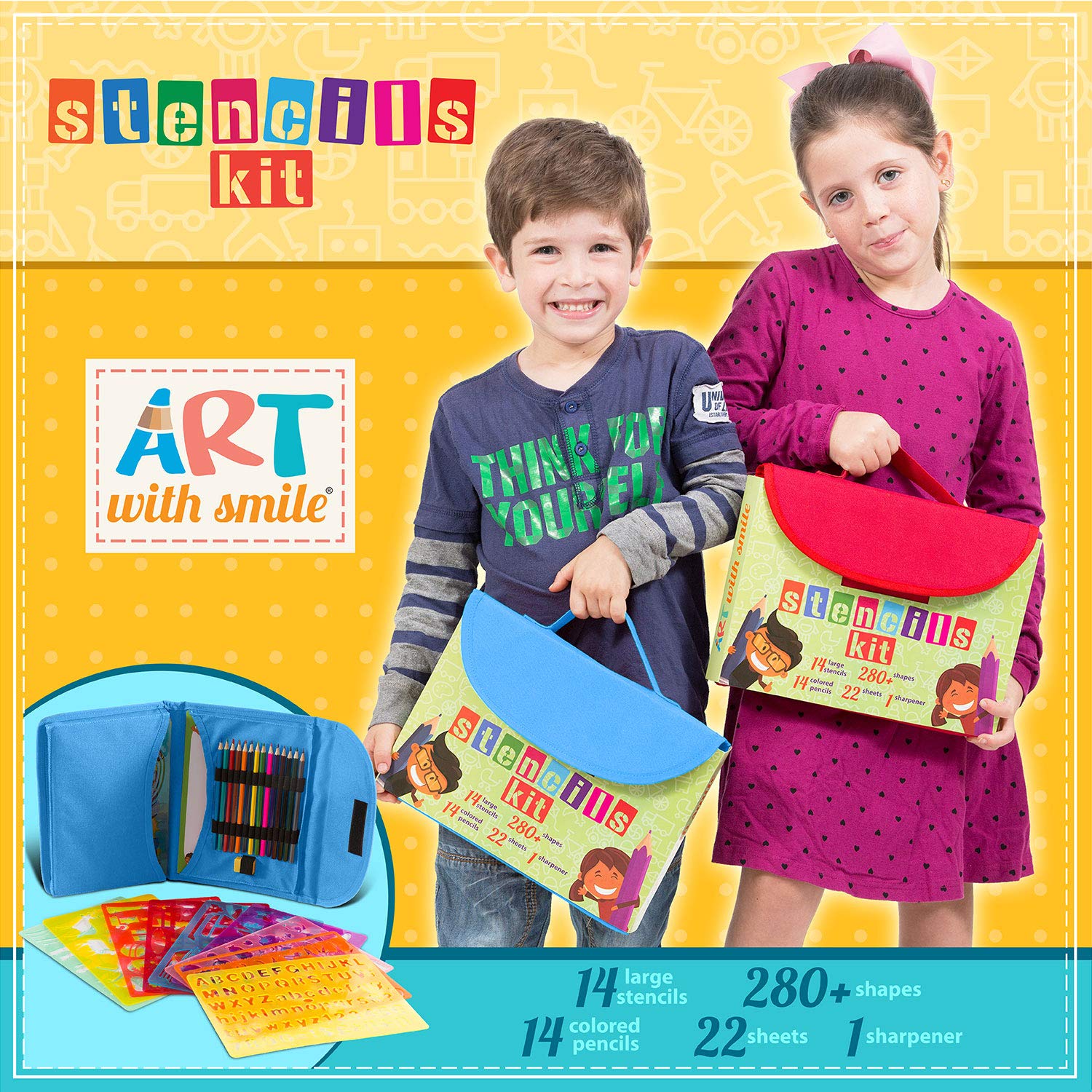 Art pochoir avec sourire conçu ce kit à cause une utilisation à la maison ou lors de vos déplacements. Ce kit de fun, compact et complet peut aller partout où vous allez. La coque rigide sert une surface de travail portable. Permet de garder les enfants heureux et vous divertir lors de vos déplacements, à manger à l’extérieur et la visite de abats de la famille. Le kit de pochoir contient tous les accessoires dont vous avez besoin : 14 grands pochoirs et de haute qualité crayons de nombreux format (26 x 17,8 cm), 14 et 22 pages (26 x 17,8 cm). Tout a été soigneusement fabriqué afin que les enfants vont profiter des heures de plaisir créatif avec pas de gâchis ou de frustration.