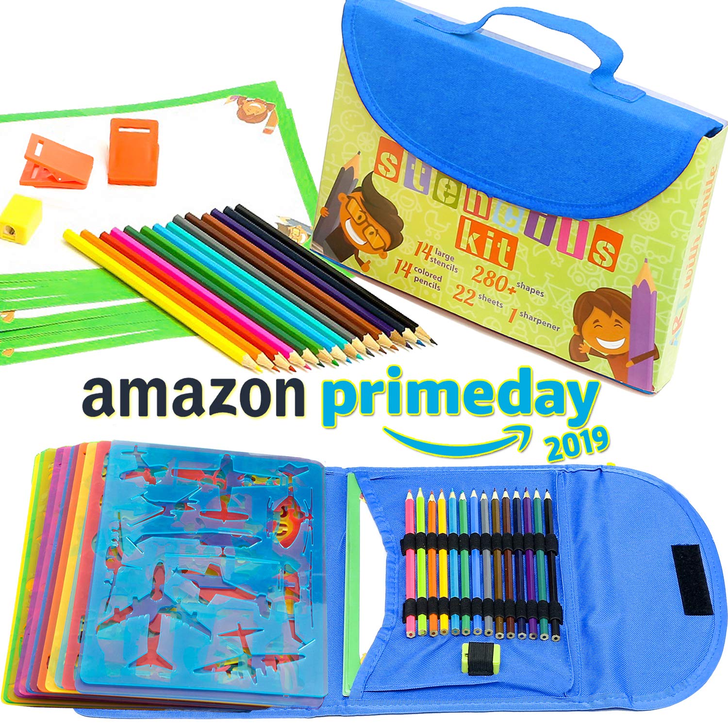 Tout en un – Le kit de pochoirs incluant un étui de rangement spécial, 14 grands gabarits de dessin en plastique, 22 feuilles de papier vierge, 14 crayons de couleur, 1 taille-crayon et 2 clips bonus
