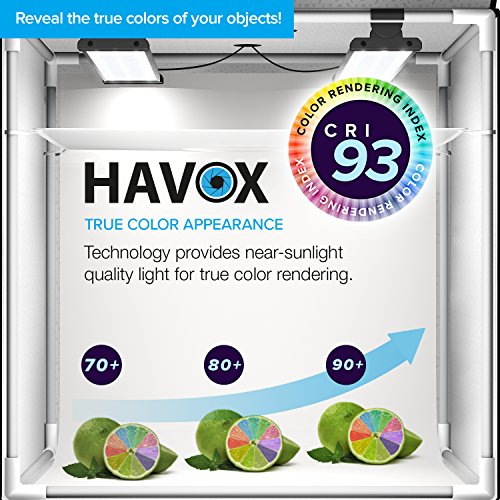 ÉCLAIRAGE LED HQ: Le studio photo Havox® est équipé de 60 lampes LED SMD spéciales photo dimmable qui offrent une quantité de lumière parfaite pour produire des photos lumineuses et éclatantes. Les LEDs disposent d’une température de couleur de 5500k, d’un flux lumineux de 13000 lumens et d’un IRC de 93+. Notre nouveau modèle de rampe LED orientable facilitera la prise de photos d’aspect professionnel avec une qualité bien supérieure à celle des photos produites avec des lampes traditionnelles.