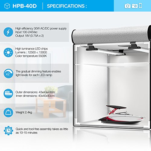 TAILLE MAXIMALE DE L’OBJET: Pour le modèle HPB-40D, nous recommandons de prendre des photos d’objets de taille inférieure à (L)25cm × (l)25cm × (h)25cm pour assurer un éclairage uniforme.