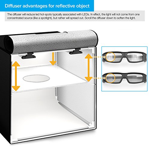 ADAPTABILITÉ: Plusieurs ouvertures à l’avant et sur le dessus vous permettront de choisir l’angle désiré en fonction de la taille des objets photographiés. Pas besoin de s’inquiéter des reflets sur les objets brillants, car un tissu diffusant la lumière est inclus pour éliminer les reflets et assurer un éclairage uniforme. Inclus avec le studio photo 3 nuances de fond différentes en plastique souple, qui vous donnent la possibilité de sélectionner le fond qui conviendra le mieux à votre objet.