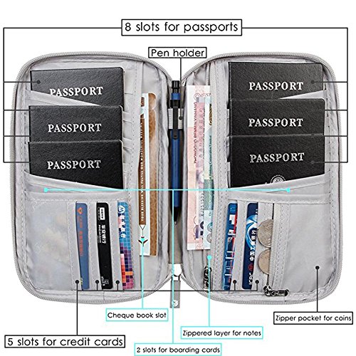 Le détenteur du passeport est assez grand pour contenir toutes les affaires de voyage. Chaque porte-document de voyage comporte 8 emplacements de passeport, 2 fentes de carte d’embarquement, 5 fentes de carte de crédit, 1 fente de billet, 1 fente d’argent, 1 pièce stockage avec fermeture à glissière, 1 fente pour stylo, une poche sur le devant du portefeuille pour le téléphone ou tout autre chose et derrière une poche à fermeture éclair pour certains effets personnels importants.