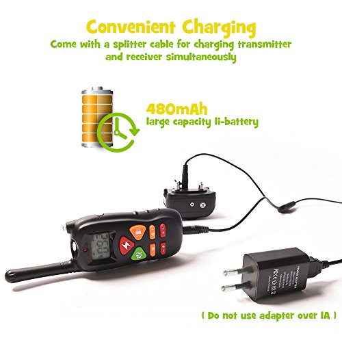 Rechargeable & étanche – intégré une batterie 300mAh rechargeable, le récepteur du collier avec boîtier étanche IP65 peut être complètement rechargée en 2h, s’il est complètement chargé, le collier-récepteur peut travailler à cause 5-10 jours, l’émetteur peut travailler à cause 10-20 jours, non seulement convient à cause la formation de temps ensoleillée, mais aussi convient les jours pluvieux légers