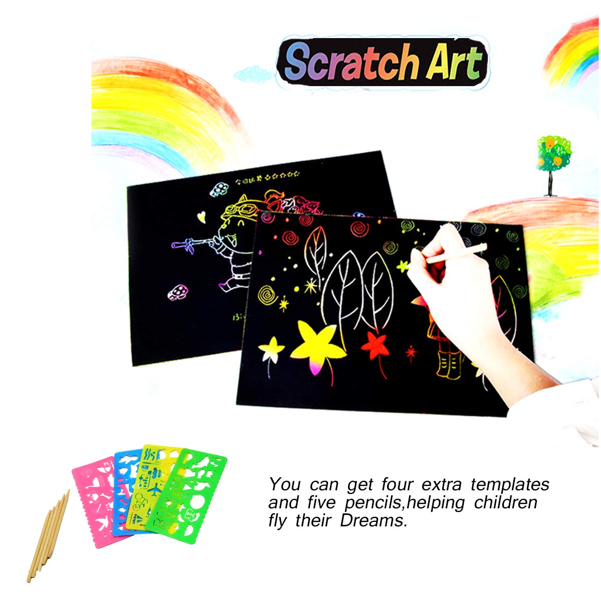 Magic Doodle Note: 50 Feuilles à Gratter Papier Gratter, 5 Stylets en Bois, 4 Règles de Gabarit. Chaque papier avec une couche de couleur holographique arc-en-ciel amusante cachée sous le revêtement noir mat.Avec quantité et accessoires dans la pratique du dessin. Le compagnon de voyage idéal dans tous les enfants et toutes les heures de plaisir scolaire.